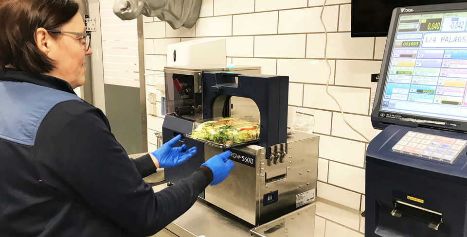 De udfordringer har Camilla og SuperBrugsen nu løst med den nye RGW-560IIS – udover at veje bakken og printe etiketten, så sætter systemet automatisk etiketten hele vejen rundt om bakken og fastholder låget. Det er en slags bandarole-etiket, som samtidig udgør en sikkerhedsforsegling, som forhindrer utilsigtet åbning og luftindtrængning, så varen er beskyttet og holdbarheden ikke forringes.