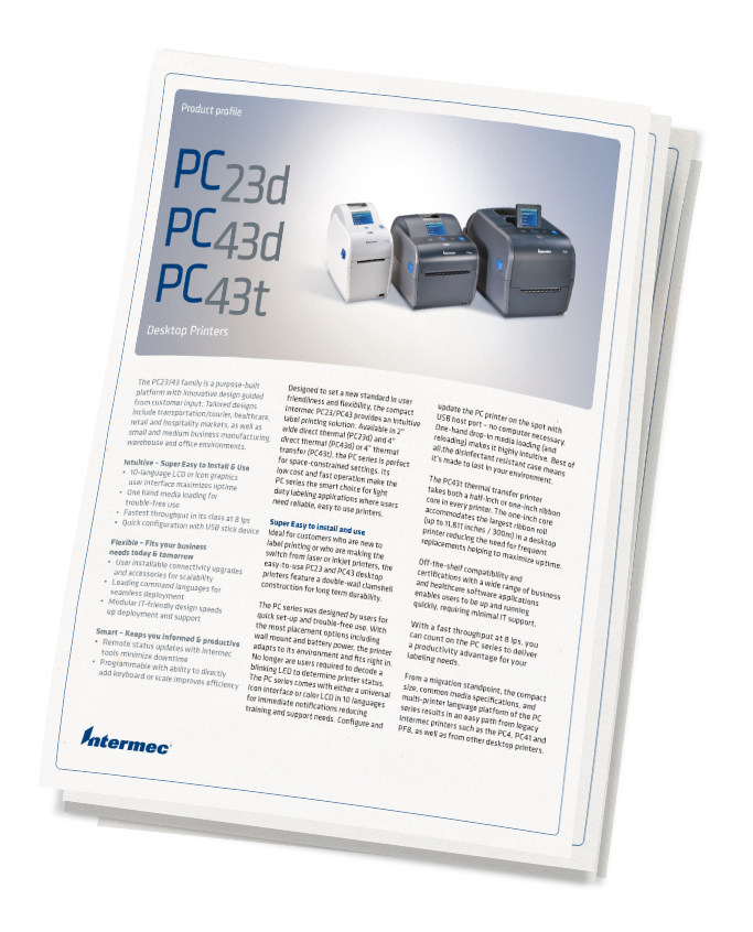 Honeywell PC43d er særdeles nem at installere og betjene. Denne kompakte desktop-printer – blot 101 mm bred - er velegnet til steder, hvor der ikke er meget plads, og kan løse etiket-opgaver inden for detailhandlen, transport-/kurervirksomheder, sundhedssektoren, servicevirksomheder samt små og mellemstore produktionsvirksomheder, lager-og kontormiljøer.