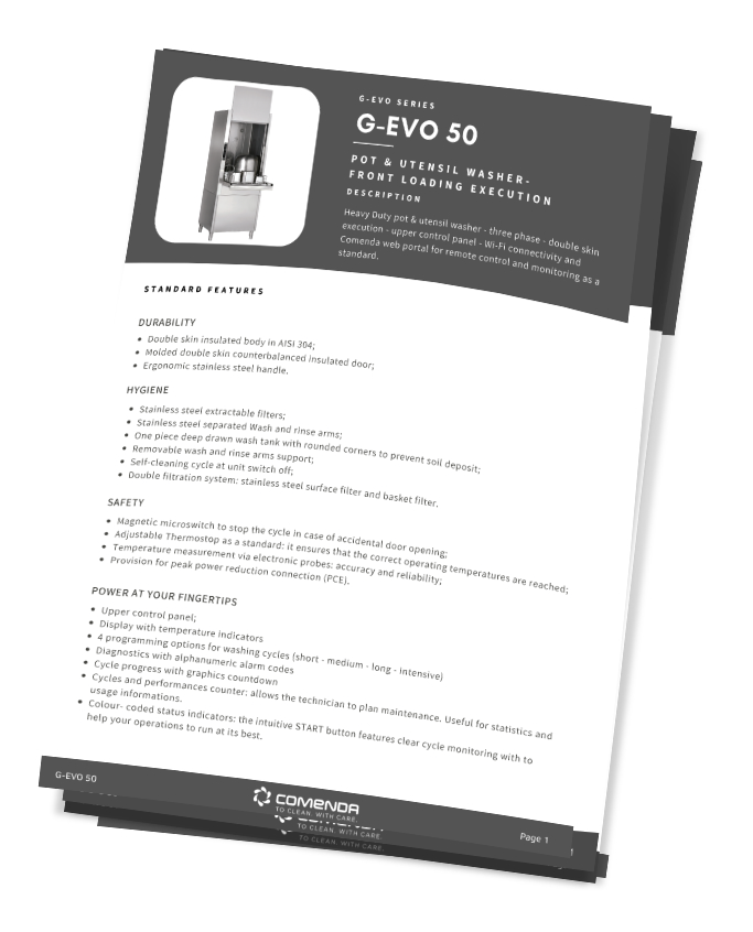 Comenda G-EVO 50 er en driftsikker og brugevenlig grov-opvaskemaskine med plads til en 550 x 660 mm opvaskebakke. Maskinen fjerner effektivt de mest genstridige pletter, snavs, fedt samt fastbrændte madrester, mens den samtidig reducerer forbrug af el, vand og opvaskemidler. Det giver mærkbare omkostningsbesparelser.