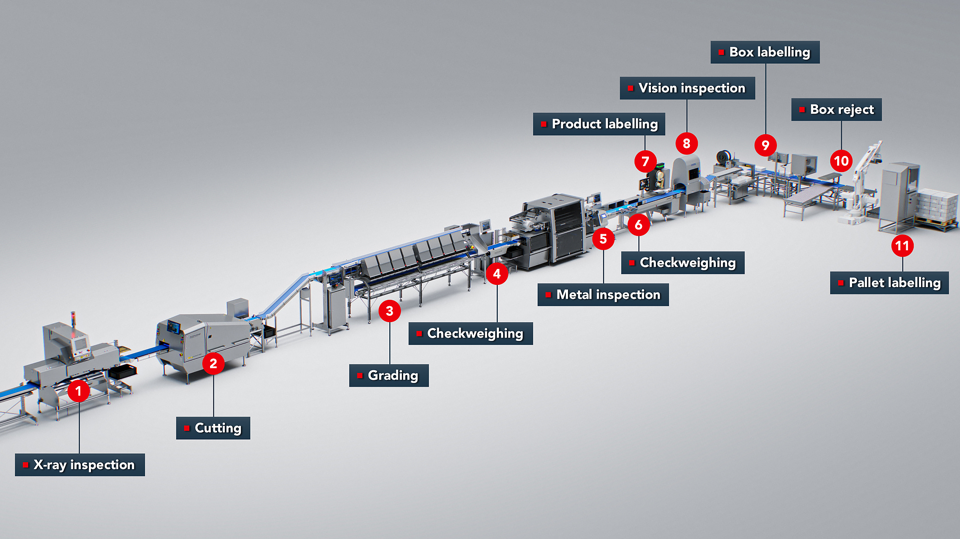 Med Scanvaegts end-to-end pakkeløsning får du fuld kontrol over opskæring, vejning, pakning og mærkning – i én strømlinet linje. Spar tid, reducer fejl og øg effektiviteten.