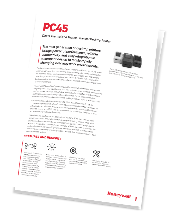 Forbind og forbliv forbundet med Wi-Fi 6 og Bluetooth® 5.1 for kontinuerlig produktivitet. WLAN-forbindelse muliggør hurtig dataindsamling og accelererede implementeringer. Smart Parse-teknologi giver dig mulighed for at ændre størrelsen på objekter, stregkoder eller skrifttype uden behov for adgang til PC45D’s backend-system. Uanset om det er på en lokal server eller i et cloud-netværk, understøtter PC45D variable netværksprotokoller og flere udskrivningssprog.