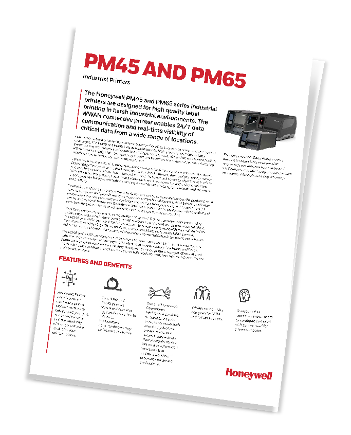 Honeywell PM45 og PM45C er robuste industriprintere designet til kvalitetsprint i barske produktionsmiljøer. WWAN connective printer muliggør 24/7 datakommunikation og realtidsvisning af kritiske data fra flere lokationer.