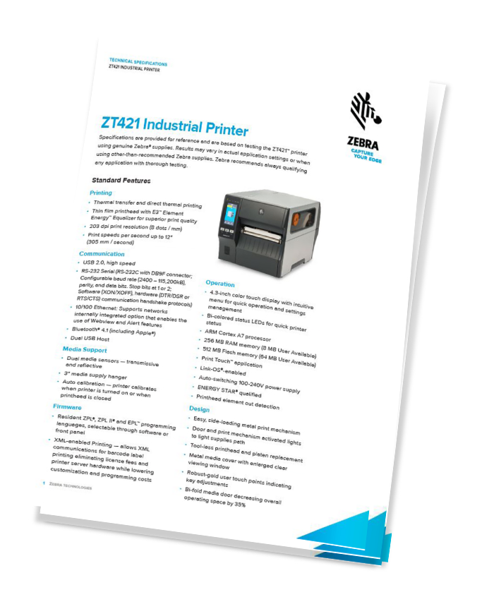 Zebra ZT421 er en hurtig og driftsikker etiketprinter med en 4,3-tommers farve-touchskærm, hvor man nemt kan se status og hurtigt ændre i indstillingerne. Printeren har en printbredde på 15 cm og kan udskrive 30 cm i sekundet.