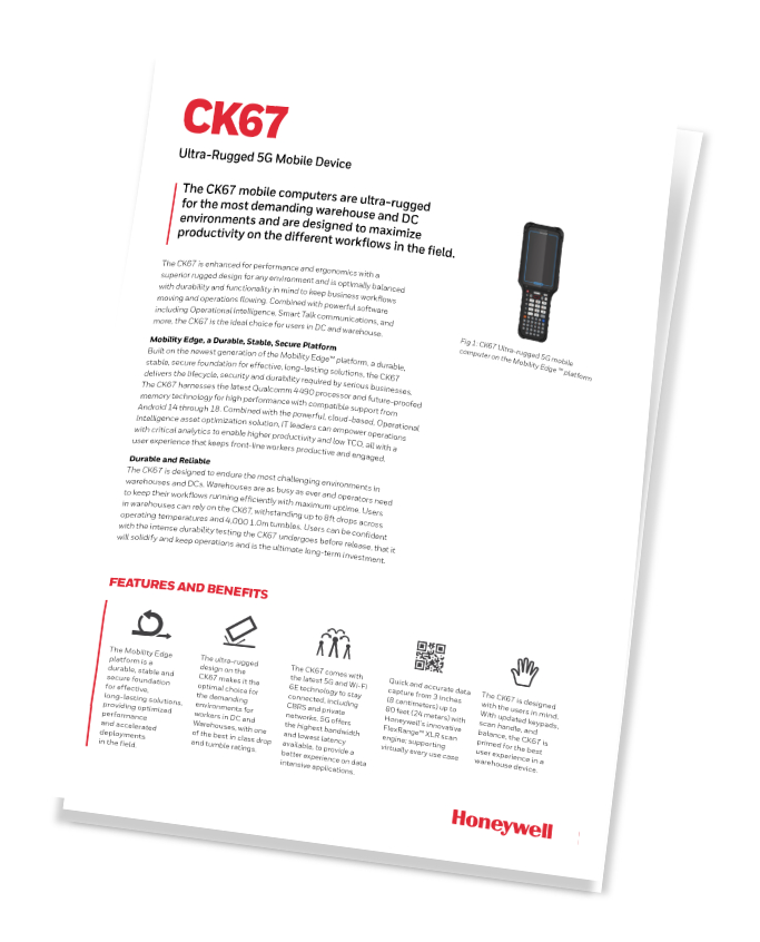 Honeywell CK67 er ultra-robuste, alsidige mobilecomputere, der leverer høj driftsikkerhed, ergonomisk design samt 5G- og Wi-Fi 6E-datatilkobling. CK67 er baseret på Mobility Edge™-platformen, som udgør en holdbar, stabil og sikker grund for effektive og langtidsholdbare løsninger.