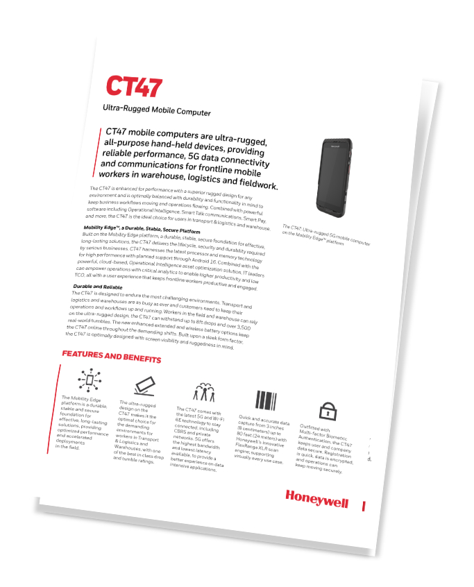 Honeywell CT47, der er baseret på Mobility Edge™-platformen, er en ultra-robust, alsidige mobilcomputer, der sikrer pålidelig ydeevne, 5G-datakonnektivitet og kommunikation for frontlinjearbejdere inden for logistik, lager og feltarbejde. Kraftfuld
