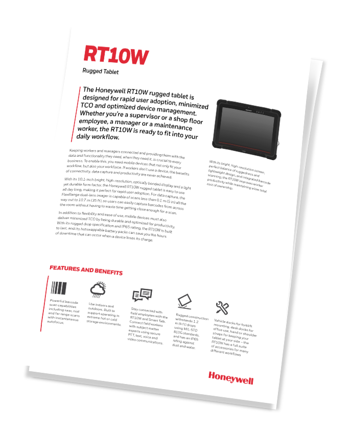 Honeywell RT10W er en robust tablet, der med en 10,1-tommers lysstærk, højopløselig skærm og en let, men robust konstruktion er nem at bruge hele dagen – perfekt til hurtig anvendelse. Køretøjsdock til montering på gaffeltruck, borddock til kontorbrug, hånd- og skulderstropper til at bære tabletten ved kroppen – RT10W understøtter et komplet udvalg af tilbehør, der passer til mange forskellige arbejdsgange.
