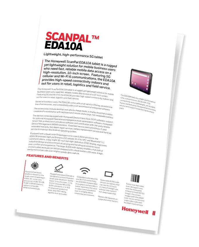 Honeywell ScanPal™ EDA10A-tabletten er en robust, men let løsning til mobile erhvervsbrugere, der har behov for hurtig og pålidelig dataadgang via en 10-tommers skærm. Med understøttelse af Wi-Fi 6 tilbyder EDA10A højhastighedsforbindelse indendørs, hvilket gør den ideel til brug i detailmiljøer og feltservice.