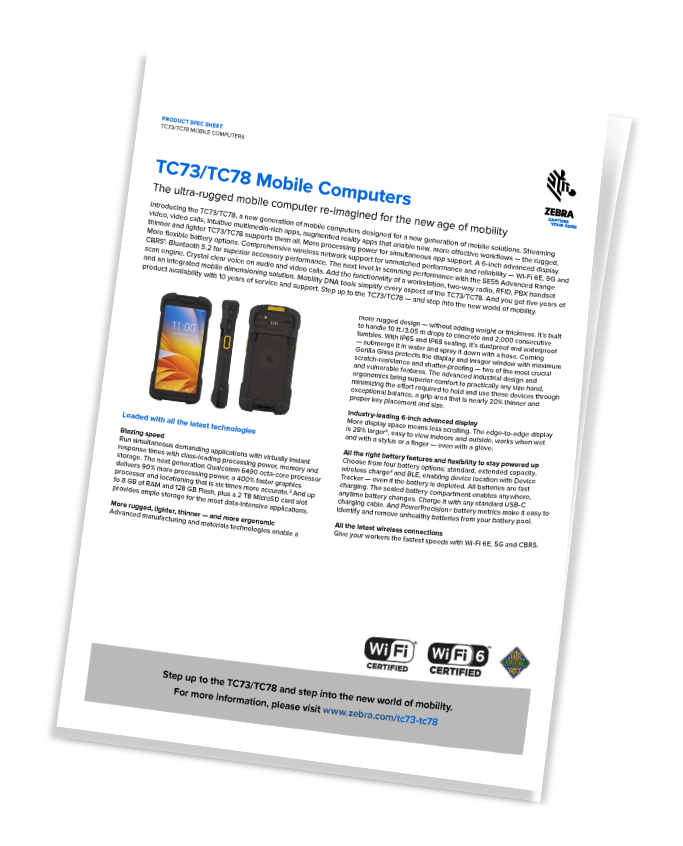 TC73 er en wi-fi 6E håndholdt computer, som er udviklet til nye opgaver inden for mobilitet. Den er designet til personale, som færdes inde i selve virksomheden, og denne mobile løsning har alt, hvad du har brug for: wi-fi 6E for en hurtig og driftssikker trådløs forbindelse, et klart og letlæseligt 6-tommer Full HD-display, større ydeevne, hukommelses- og opbevaringskapacitet til understøttelse af ”tunge” og krævende apps samt en udvidet scanner, som kan opfange stregkoder tæt på og på en afstand helt op til 12,2 meter. En ekstra robust computer, som samtidig er næsten 20 % tyndere, lettere og mere ergonomisk.