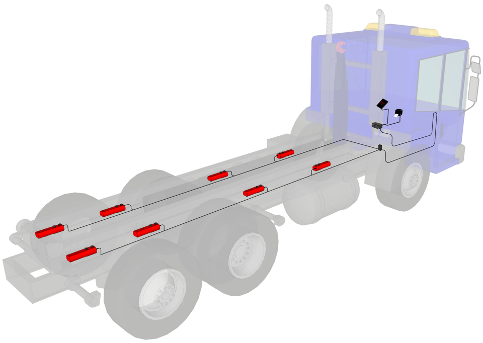 En chassisvægt til hejselad består af otte vejeceller, kabler, vejeinstrument og kvitteringsprinter. Installationen udføres på nye køretøjer eller som eftermontering. Vejeceller monteres mellem chassiset og opbygningen, og et display i førerhuset viser tydeligt, hvor meget der på- eller aflæsses samt den totale last.