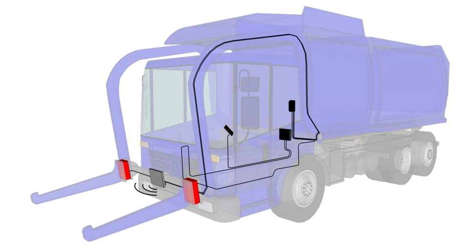 Systemet, som består af antenne, læser, kabler og en førerhus-computer, er monteret på køretøjet til aflæsning af RFID-tags, derer monteret på affaldscontainere.