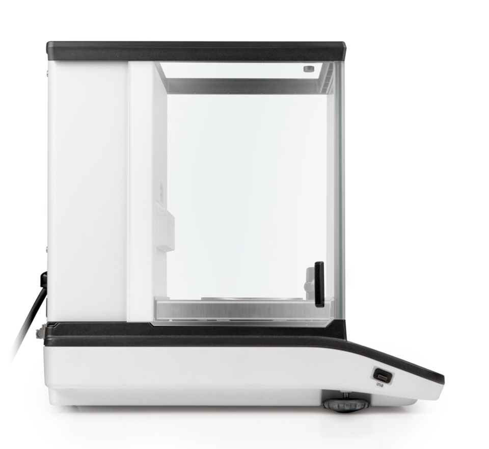 - Stort glasvejehus med tre skydedøre giver let adgang til prøven og stabil vejeproces.