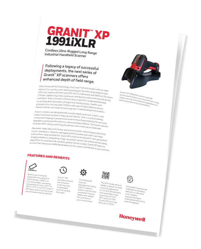 - Das Granit™ XP XLR-Modell ist ideal geeignet für normales Nahbereichsscannen von 1D- und 2D-Barcodes sowie für maximale Reichweite beim Scannen von UPC-Codes bis zu 2 m und 100 mil-Codes bis zu 24 m.