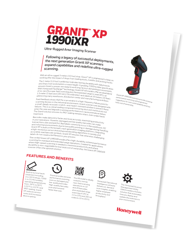 Schlechte Etiketten treten oft in Lager- und Industrieumgebungen auf, bedingt durch mangelhaften Druck oder Schäden. Granit XP, basierend auf Honeywells Bildverarbeitungsplattform der nächsten Generation, sorgt dafür, dass solche Etiketten keine Engpässe verursachen. Das Granit™ XP 1990iXR-Modell bietet hohe Haltbarkeit und extreme Scanleistung – vom Kontaktpunkt bis zum obersten Regal. Entwickelt für Anwendungen, bei denen Hochgeschwindigkeitsscannen erforderlich ist, um die Produktivität zu maximieren, und Haltbarkeit unverzichtbar ist, um niedrige Gesamtbetriebskosten zu gewährleisten.