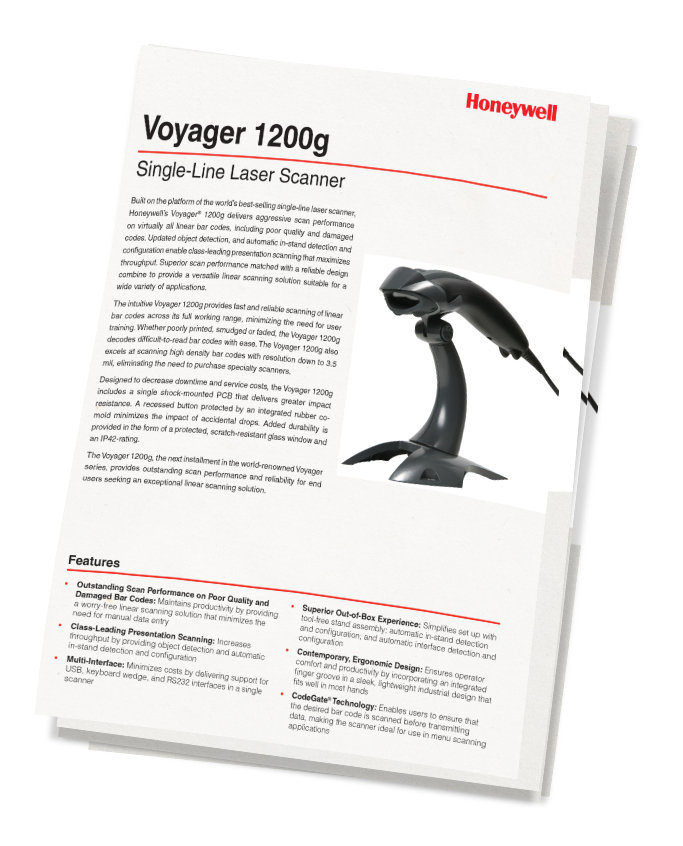 Die Laserbarkodescanner Voyager™ 1200g (mit Draht) und 1202g (drahtlos) scannen aggressiv und virtuell alle linearen Barcodes - und sie leisten ausgezeichnete Arbeit, indem sie auch Barcodes schlechter Qualität und sogar beschädigte Barcodes einlesen.