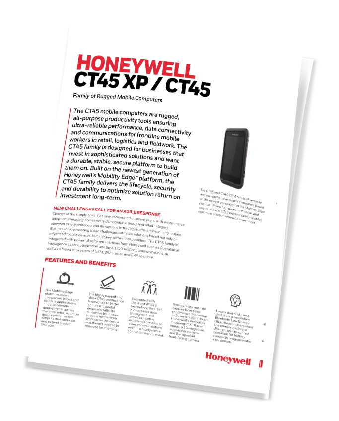 Der Honeywell CT45XP basiert auf der Mobility Edge™-Plattform und ist ein robuster und vielseitiger Mobilcomputer, der zuverlässige Leistung, Datenkonnektivität und Kommunikation für Mitarbeiter im Einzelhandel, in der Logistik und im Außendienst bietet.
