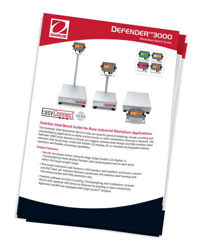 Ohaus Defender 3000 Washdown i-D33 eignet sich für allgemeine Wiegen, einfache Stückzähl- und Kontrollwiegeaufgaben in feuchten Umgebungen oder wenn gründliche Reinigung erforderlich ist.
