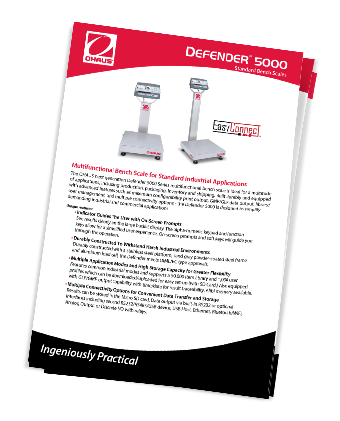 Ohaus Defender 5000 Standard D52 eignet sich für Wiegen, Stückzählen, prozentuales Wiegen, Kontrollwiegen, dynamisches Wiegen/Anzeige haltung und Füllprozesse in der Produktion sowie in Verpackungs-, Lager- und Versandabteilungen.