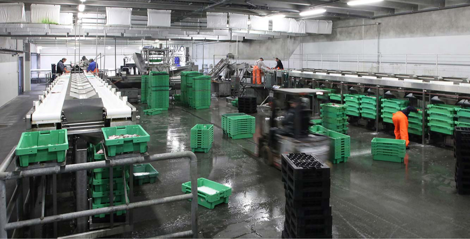 The mixed catch, averaging 20 tons per fishing vessel, is delivered in crates at the quay. After manual coarse sorting by species per crate, the crates are automatically tipped onto the machine, which grades the fish and distributes them into new crates with labels. Each batch receives a unique lot number.