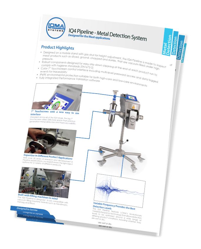 This system is designed to be used with pumped and flowing products such as meat slurries, soups, sauces, jams or dairy.Designed to be on a mobile stand with gas strut for height adjustment (meat applications) or a fixed L Bracket (non-meat applications), the IQ4 Pipeline is built to IP69K rating making it suitable for both high-care and low-care environments.