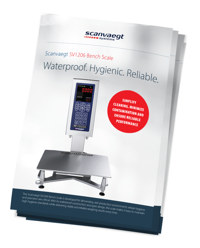 The Scanvaegt SV1206 is a cost-effective stainless steel washdown bench scale designed for food processing and wet production environments. With a weighing plate in AISI 316 stainless steel and hygienic open-frame design, this waterproof bench scale helps you maintain food safety standards, streamline cleaning processes, and minimize contamination risks. Ideal for small to medium food processors who need reliable, affordable and hygienic weighing equipment.