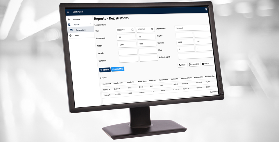 The ScanReports module provides your customers with access for retrieving their weighing data from your ScanX.NET system. It makes it easy for your customers to retrieve data and saves both them - and a you - a lot of time when they have to send invoices and statistics to their own customers.