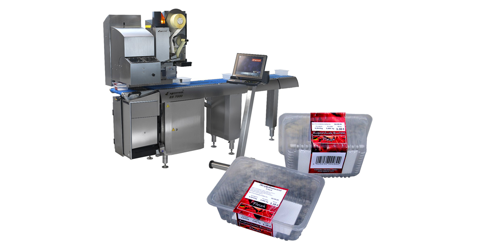 Det nye automatiske veie- og etikettmerkingssystemet ES7700 C-Wrap gjør det mulig å feste etiketten rundt tre av sidene på pakken (topp, side og bunn). Etiketten sitter perfekt og tett inntil pakken selv om denne har fremstående kanter.