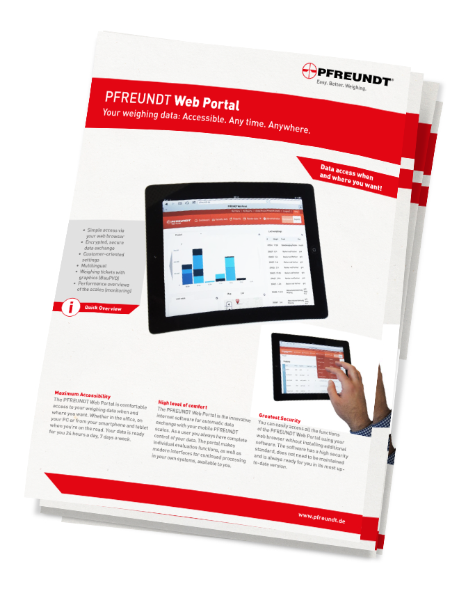 Pfreundt Webportal er en innovativ, nettbasert programvare, som overfører data automatisk fra dine mobile Pfreundt-vekter. Som bruker har du alltid full kontroll over veiedataene dine. Webportalen gjør det mulig å gi deg individuell statistikk og rapportering med moderne grensesnitt. Data kan også overføres til eksterne systemer.