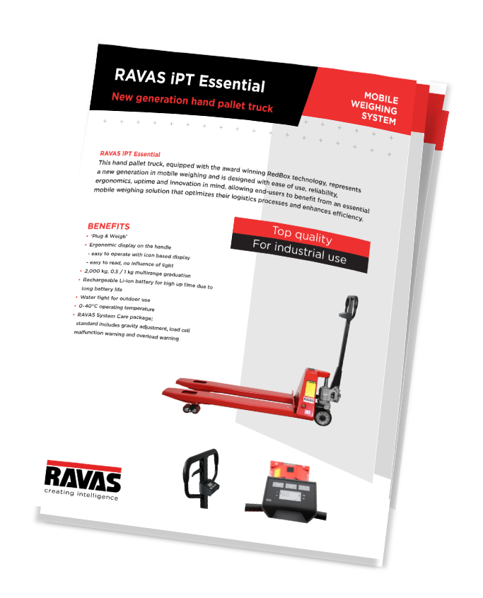 RAVAS iPT Essential kombinerer effektivitet, brukervennlighet og presisjon i én prisgunstig mobil veieløsning. Denne innovative jekketralleen med integrert veiefunksjon er ideell for bedrifter som raskt og enkelt vil kontrollere vekt under transport av varer.