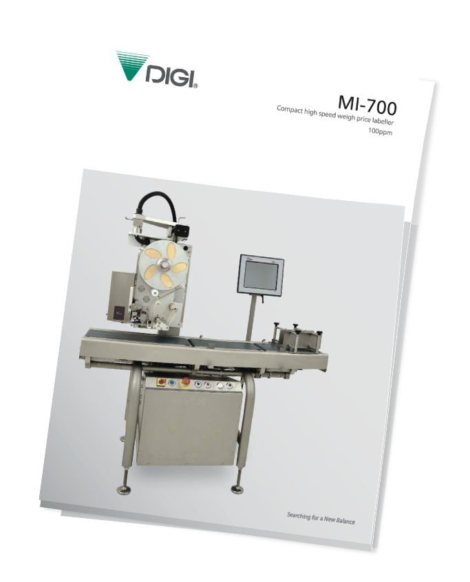 Digi MI-700 är ett automatiskt vikt- och prismärkningssystem för dynamisk vägning och märkning av upp till 80 förpackningar per minut.