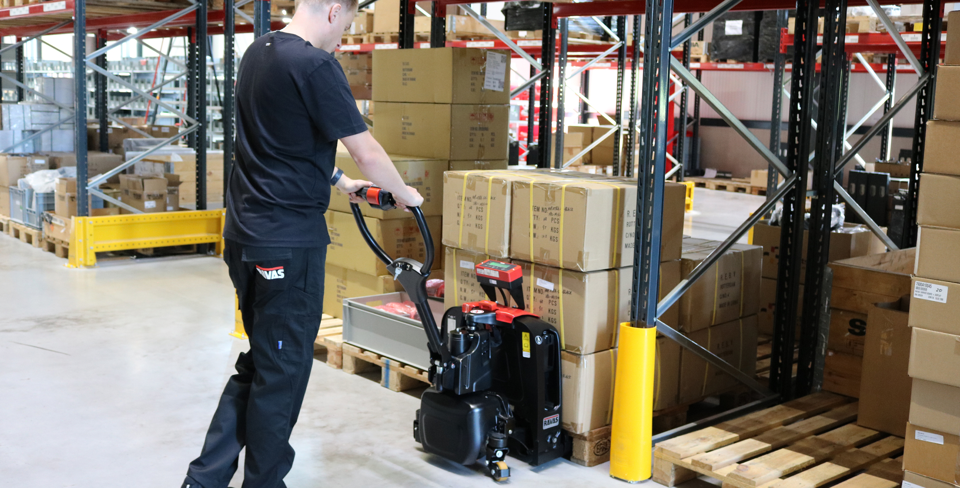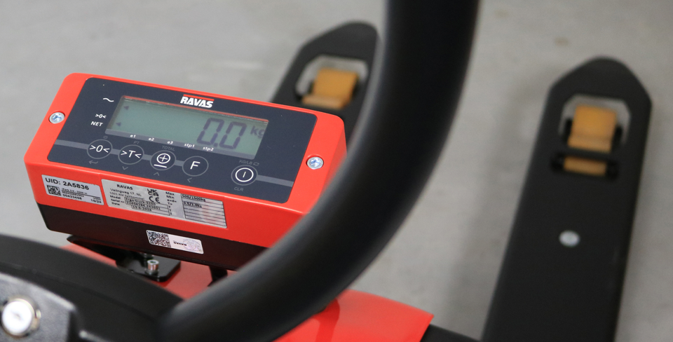 RAVAS Ergo-Truck 2 kombinerar vägning och rörelse i en pall lyftare. Den elektriska drivningen gör det möjligt att snabbt och enkelt flytta tung last över korta avstånd.